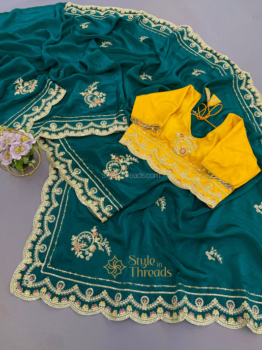 Turn heads with this deep teal green saree crafted in crushed silk fabric, beautifully adorned...