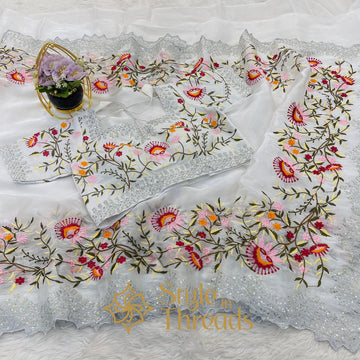 Aesthetic White Soft Shimmer Satin Organza Silk Saree with fully embroidered Stitched blouse