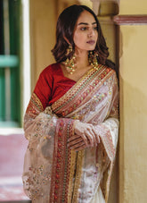 Beige Floral printed and Hand work embroidered Soft Organza Silk Saree