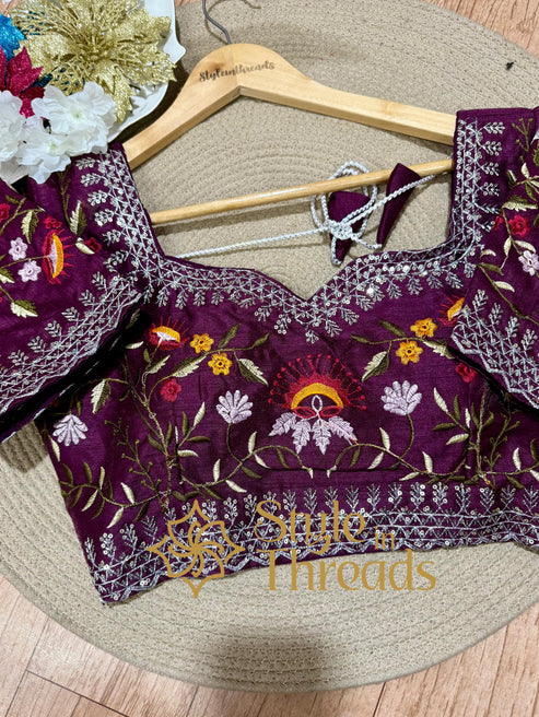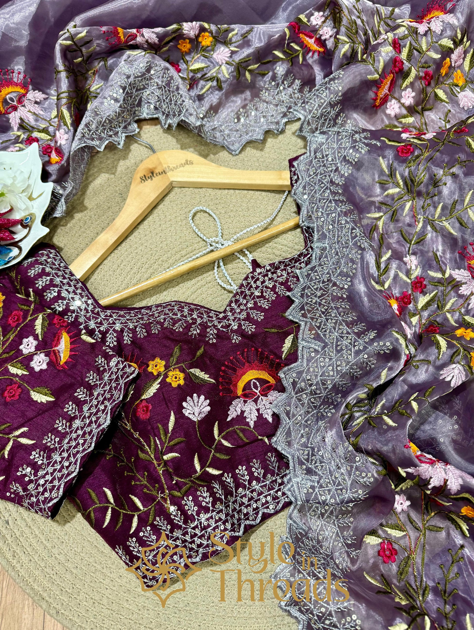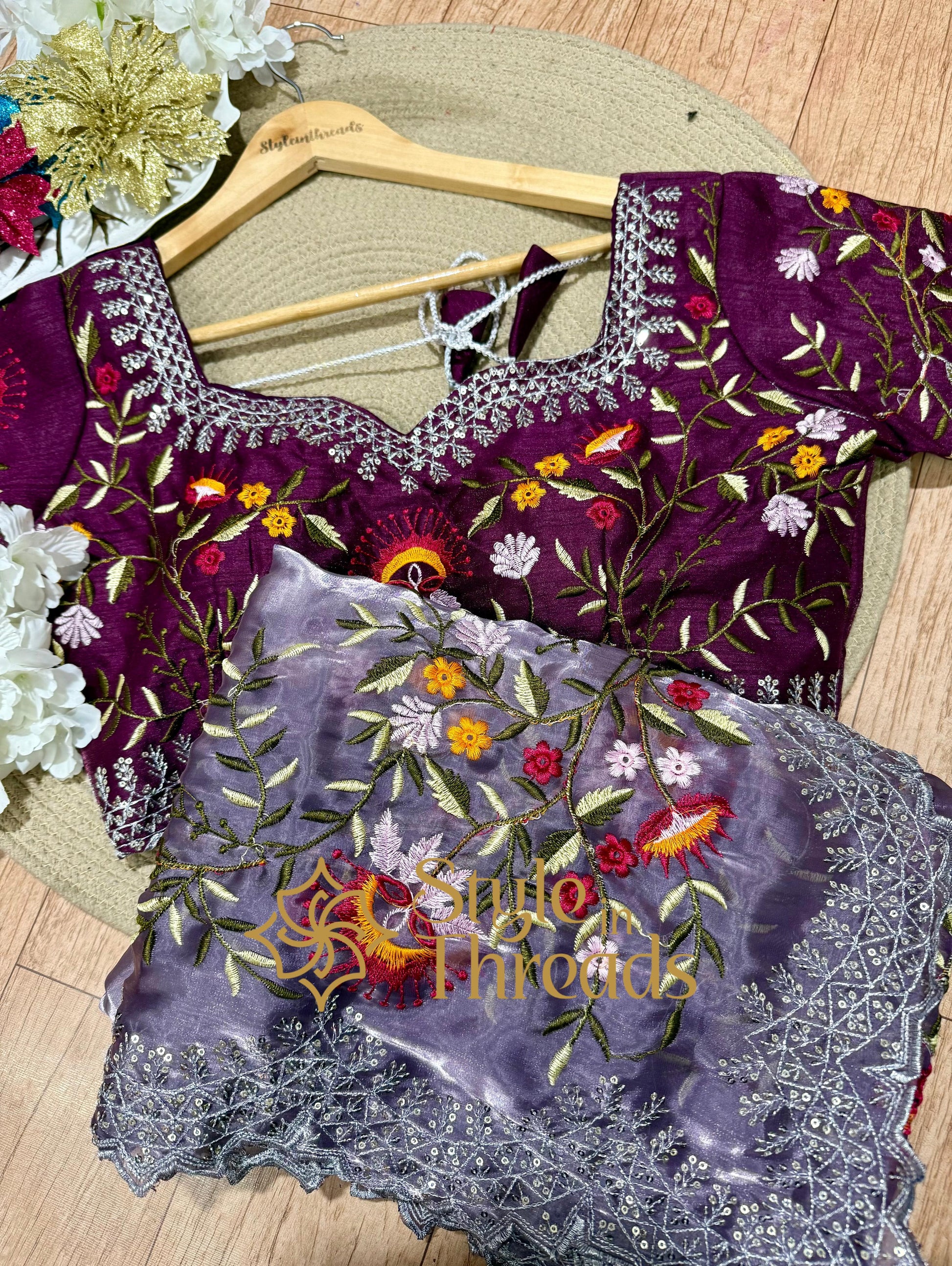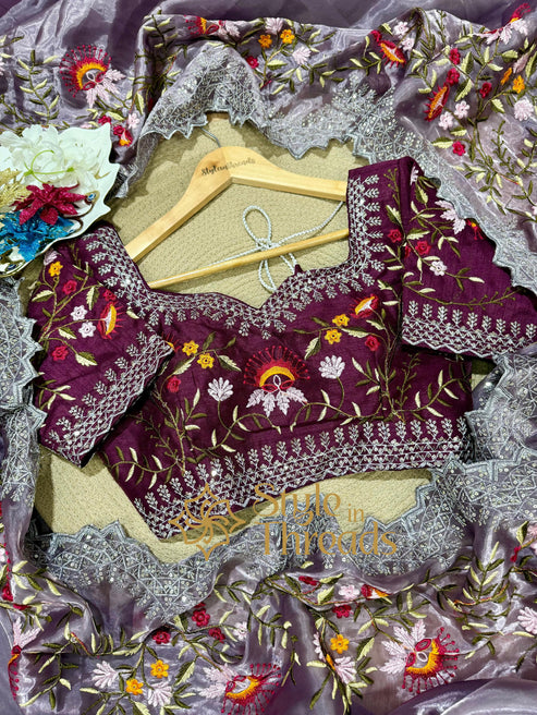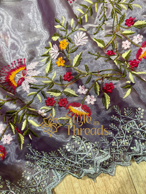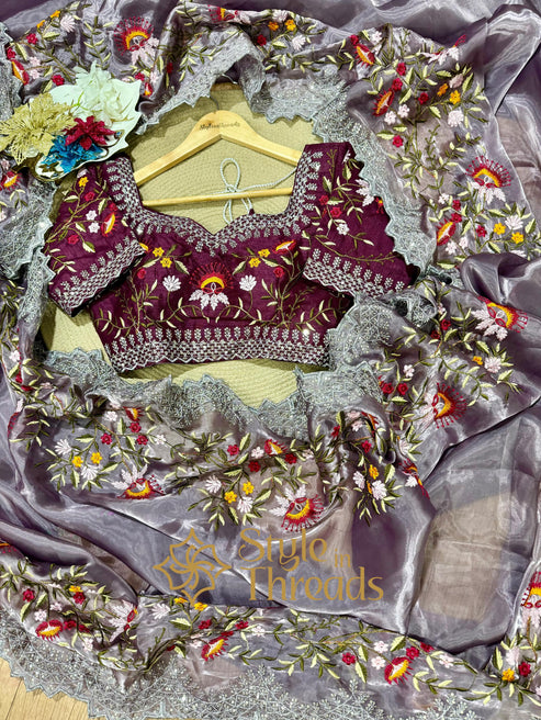 Luscious Lilac Shimmer Satin Organza Silk Saree with fully embroidered Stitched blouse