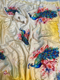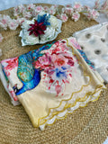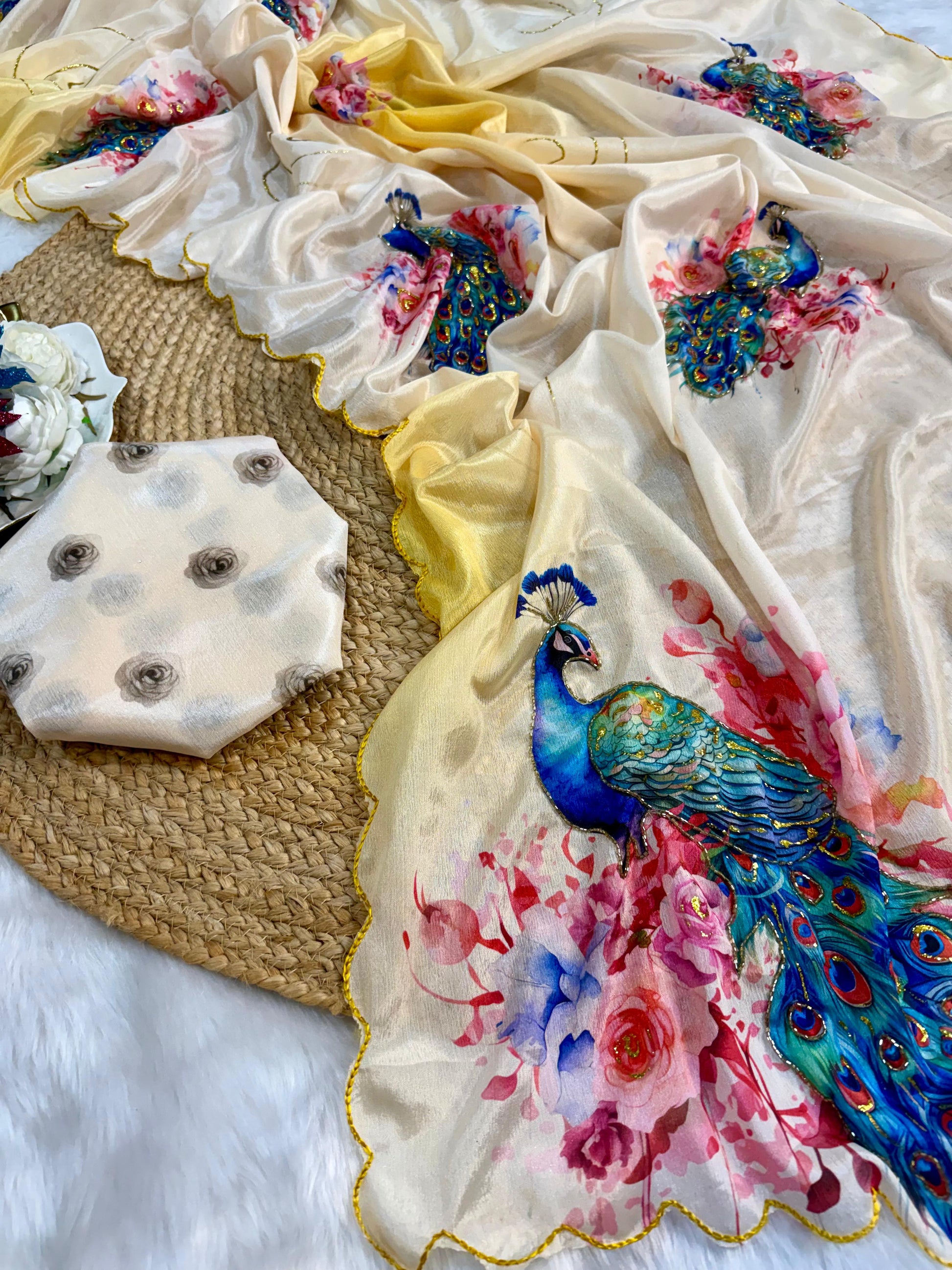 This saree is absolutely stunning — it features a luxurious cream-beige base with vivid peacock digital prints, accentuated by floral watercolor motifs in rich pink, red, and blue hues. The peacock design is beautifully detailed, giving the saree an elegant and royal aesthetic. It’s finished with a delicate scalloped golden edge, adding a graceful shimmer