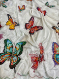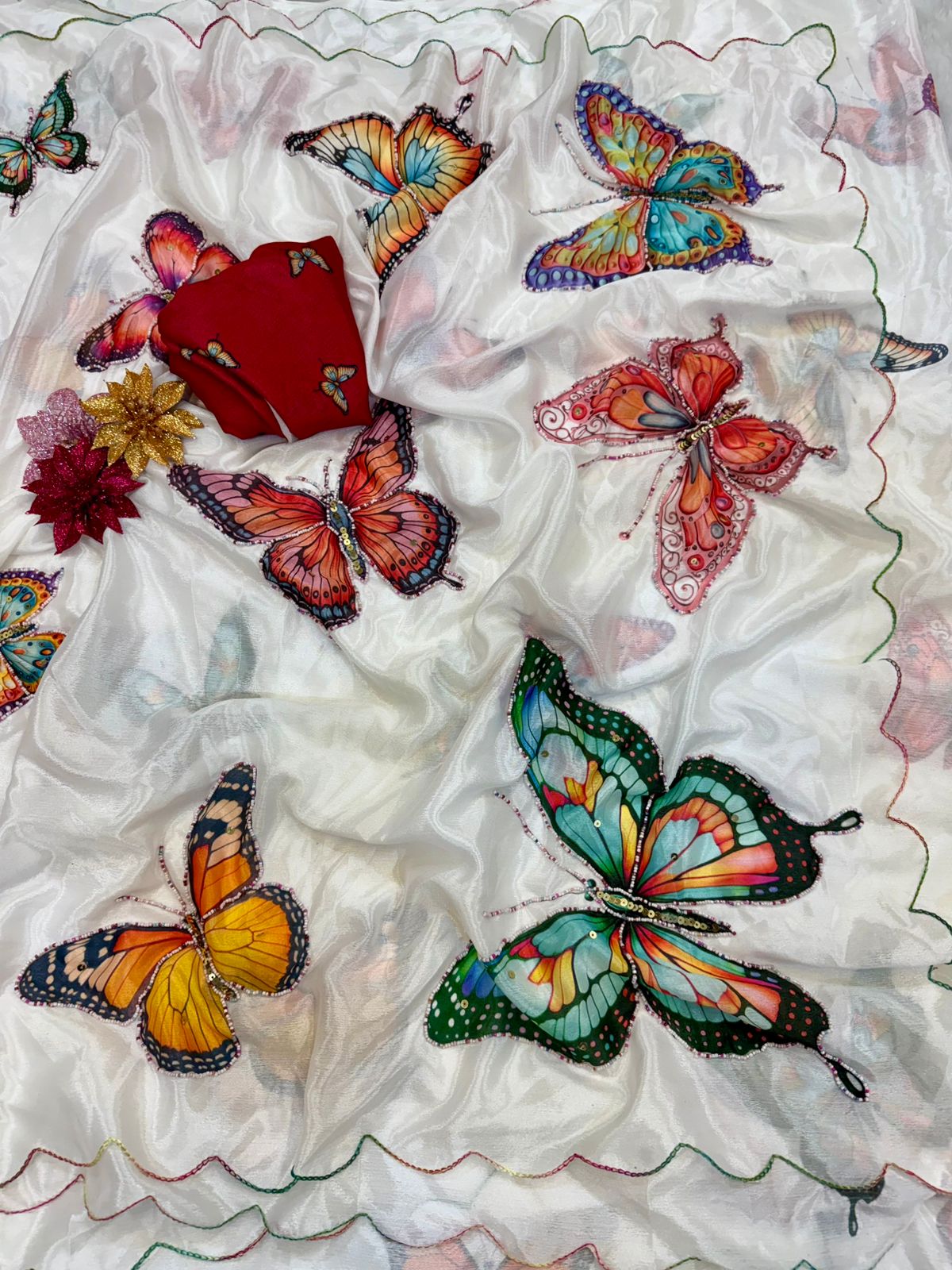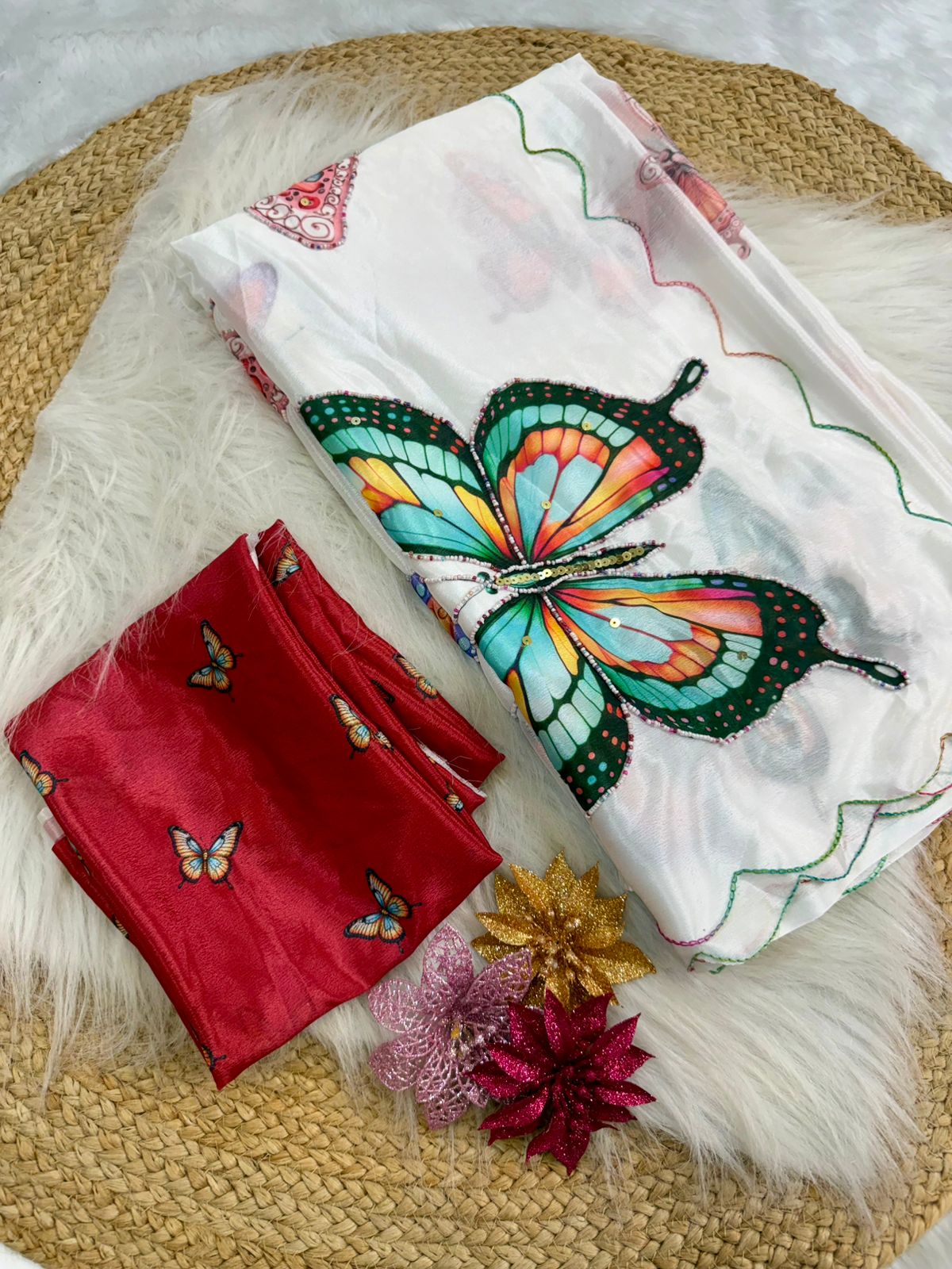 Glazed in classified malai silk fabric this saree with beautiful digital prints butterfly with handwork colourfull pearls seqnce work in all over sarees & outing colourful thread border in all over saree paired with contrast colour print malai silk fabric
