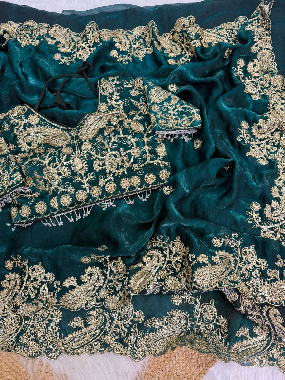 Turn heads this festive season with our *Fancy Fendy Satin Saree* adorned with all-over zari sequins work for that perfect glow.