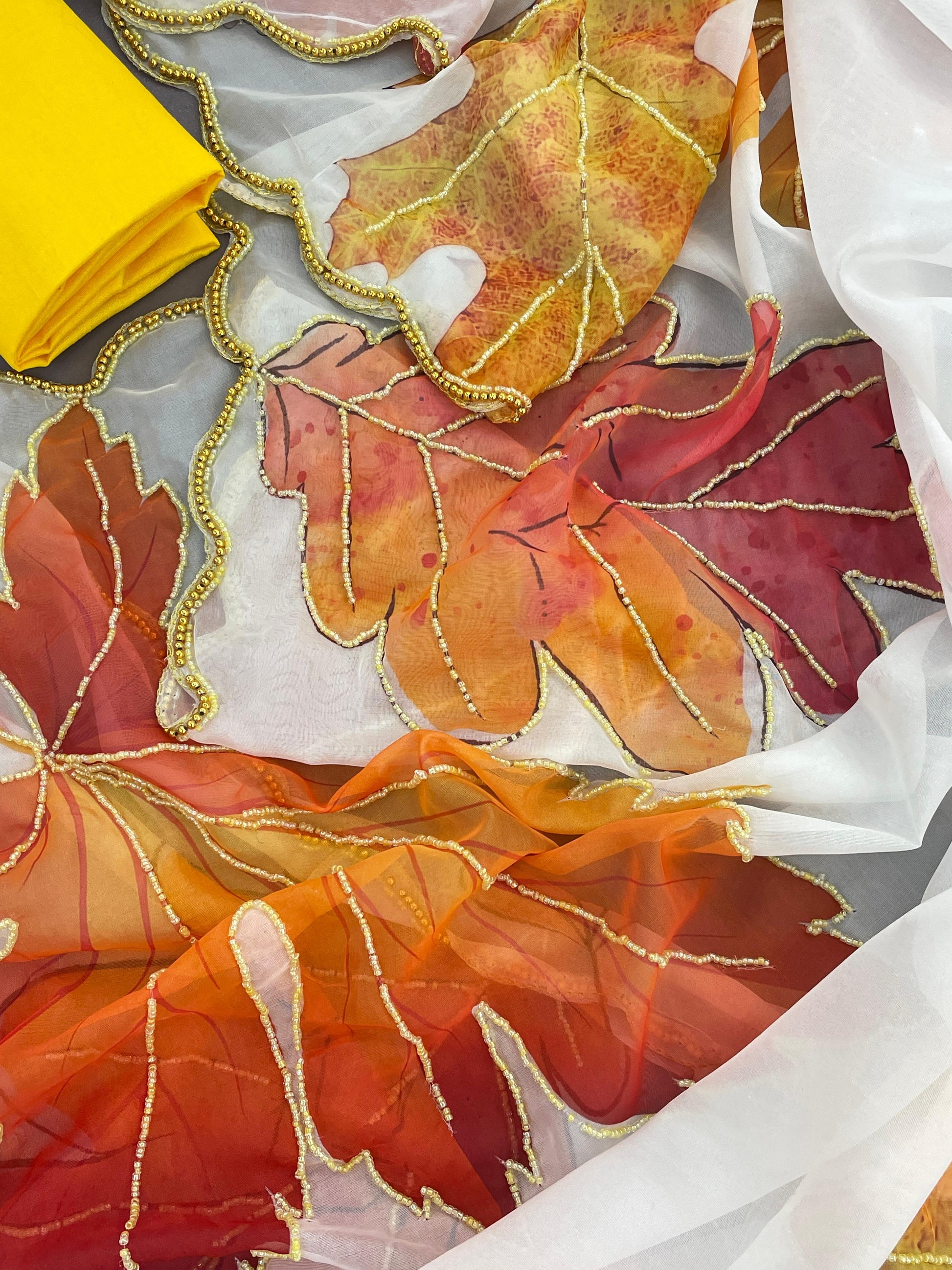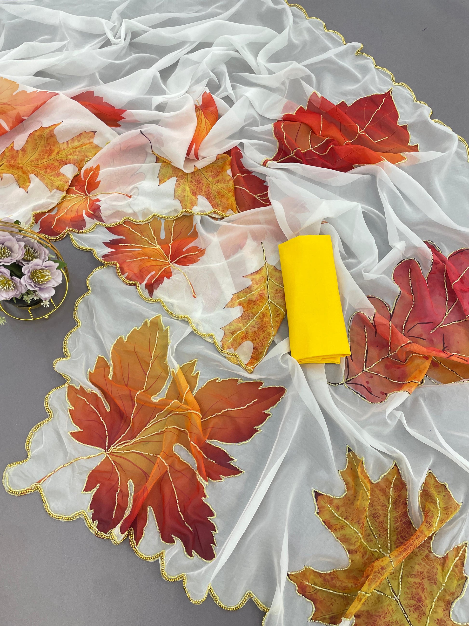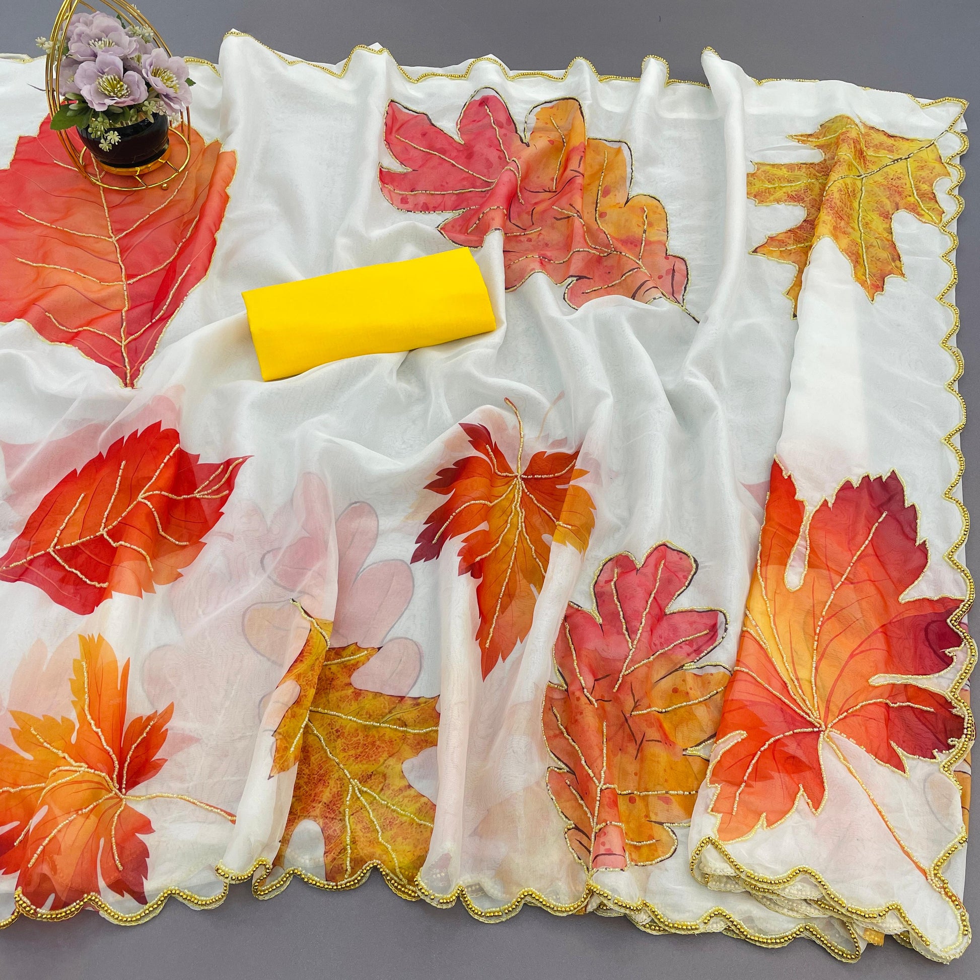 Flower samajhke rakha he kya Very smooth Organza Tabi fabric saree featuring a dreamy printed design adorned with delicate white pearl handwork embroidery all over. The saree is enhanced with an elegant pearl cutdana cutwork border for a graceful finish. Comes with an unstiched blouse in soft white with matching pearl hand work