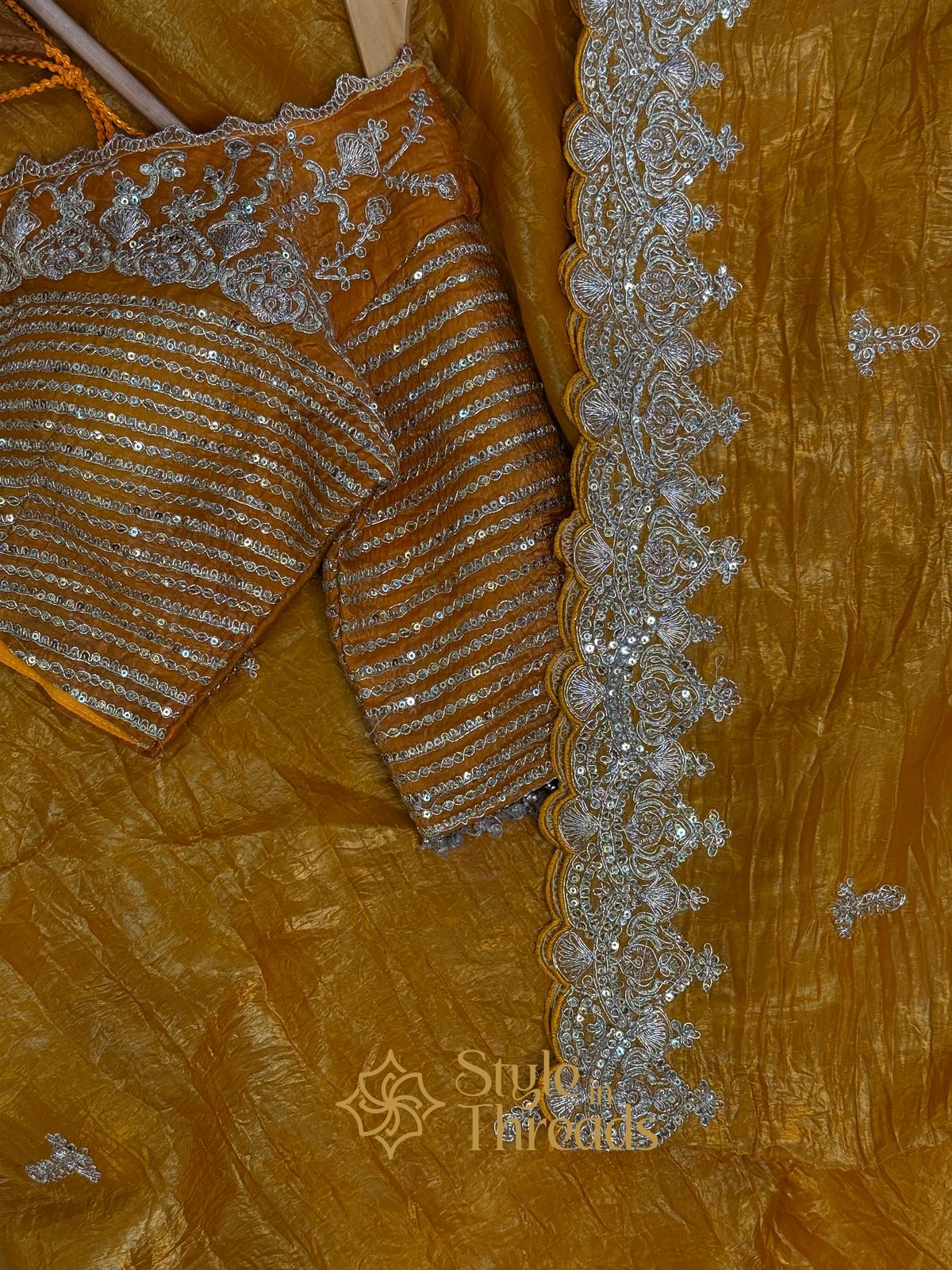 Elevate your ethnic wardrobe with this stunning mustard yellow ensemble adorned with intricate silver embroidery and sequin work. The blouse features detailed floral embroidery on the neckline and sleeves, paired with horizontal sequin stripes that add a touch of sparkle. The matching dupatta or saree fabric is richly embellished with an ornate silver lace border and delicate buti-style motifs scattered throughout. The fabric has a crinkled texture, giving it a rich and traditional look.